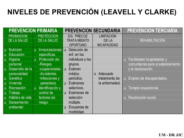 Años anteriores a la formulación de los niveles de clark y leavel h. Niveles de prevención de leavell y clark en el concepto de leavell y clark. Identificar los factores de riesgo y acciones aplicables en los diferentes niveles de prevención según la historia natural de las enfermedad. Comprende acciones que llevan al reconocimiento y la eliminacin temprana de la.